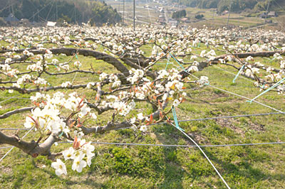 路地ではソメイヨシノよりやや開花の遅いさくらんぼの花も、加温ハウス内で開花するため、ソメイヨシノが満開の頃には散り始めています。