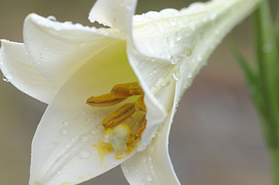| 梅雨時に咲くのはアジサイだけでなく、ちょうど開花したユリに、雨が降り雫がたくさんつていました。 |